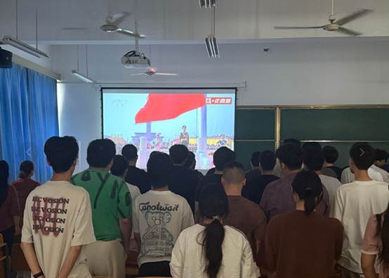 当日上午,教室里的电视准时播放阅兵直播画面。当激昂的国歌声响起,师生们全体起立,向国旗行注目礼,高唱国歌,心中的爱国之情油然而生。