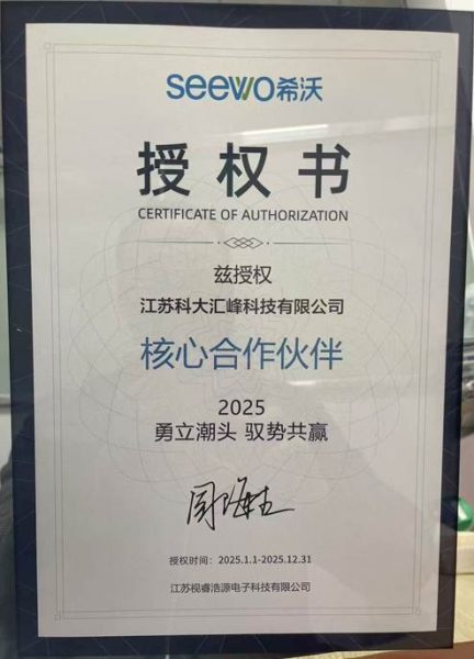 近日,江苏科大汇峰科技有限公司再获希沃“2025年度核心合作伙伴”授权,有效期覆盖2025全年。