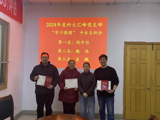 会议上,我支部对2024年支部党员学习强国情况进行了总结,评选出了前三名,并进行了表彰。学习是党员日常生活必修课,在新的一年中,我们倡议所有党员同志加强学习,并带动周围同事加入不断学习的行列,丰富自我修养,提高自身素质,厚实理论水平,指导实践工作行稳致远。